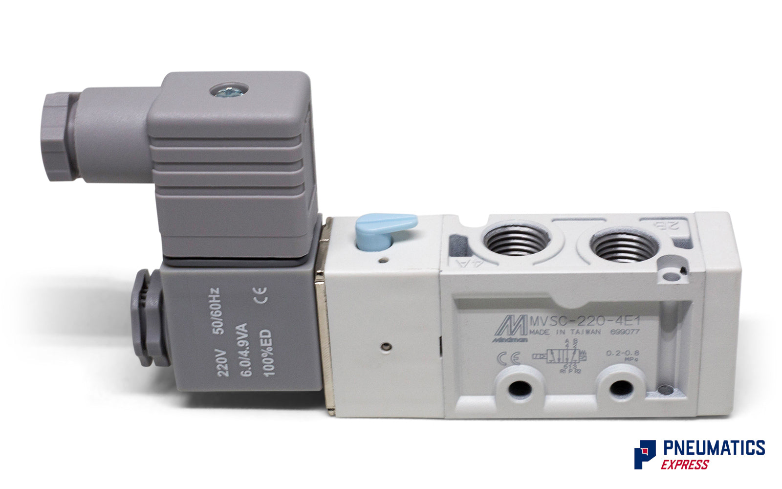 The Mindman MVSC-220-4E1 solenoid valve is a 5/2 G1/4" model with an LED indicator. This valve features a durable plastic chassis, an aluminum spool, and a high-efficiency, low-power-consumption AC220v coil. It includes a DIN connector and LED indicator, offering reliable performance at an affordable price. With an operating pressure range of 0.2~0.8 MPa and proof pressure of 1 MPa, this valve is suitable for various industrial applications.