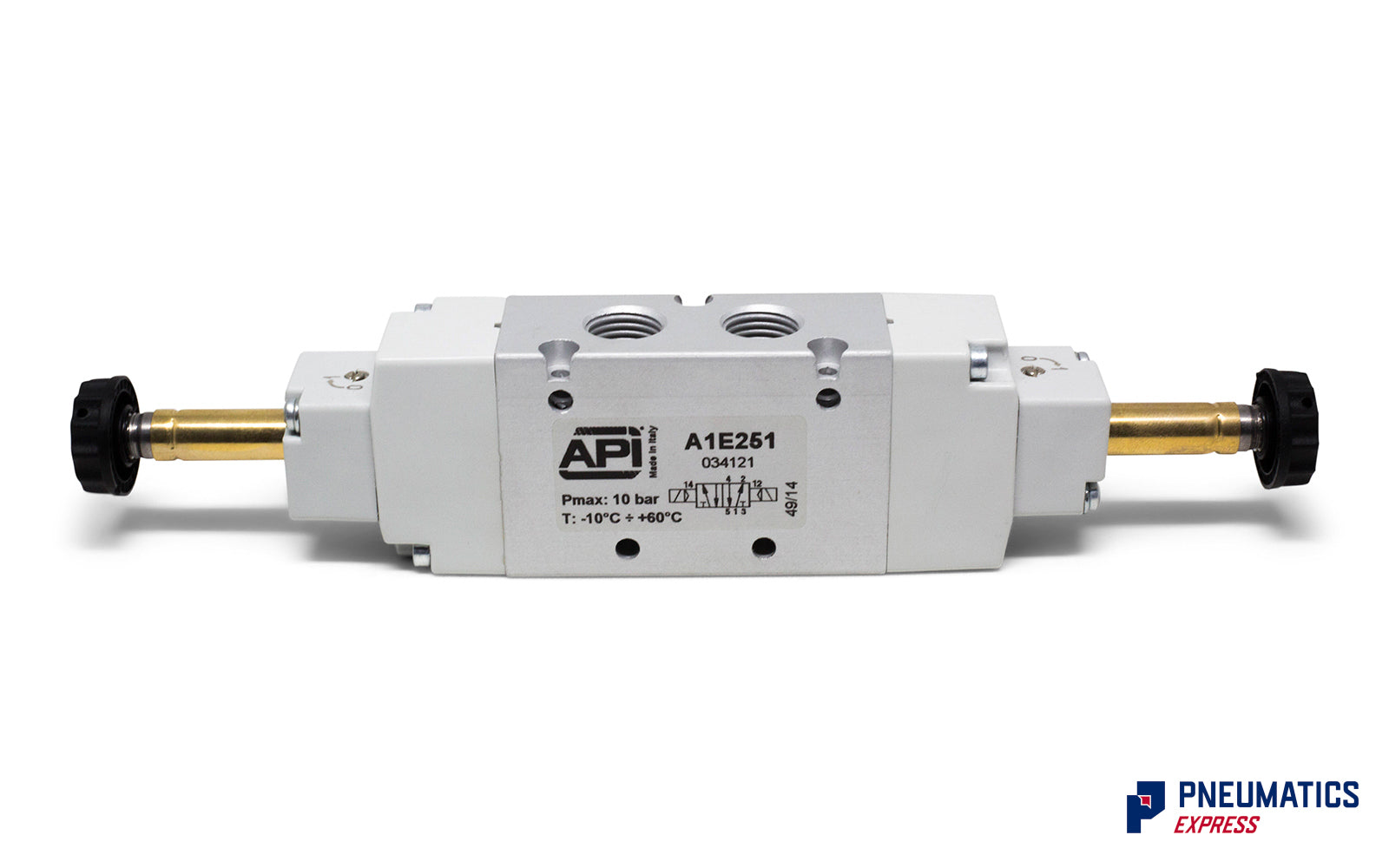 The API A1E251 is a double solenoid 1/4" valve that has 5 ports and 2 positions. It is a best seller as it is offered at competitive price point, whilst still possessing propertis of a high quality valve. For one, its metallic body is robust and offers long life for spool shift cycles, and its tight HNBR is effective at eliminiating air leakages.