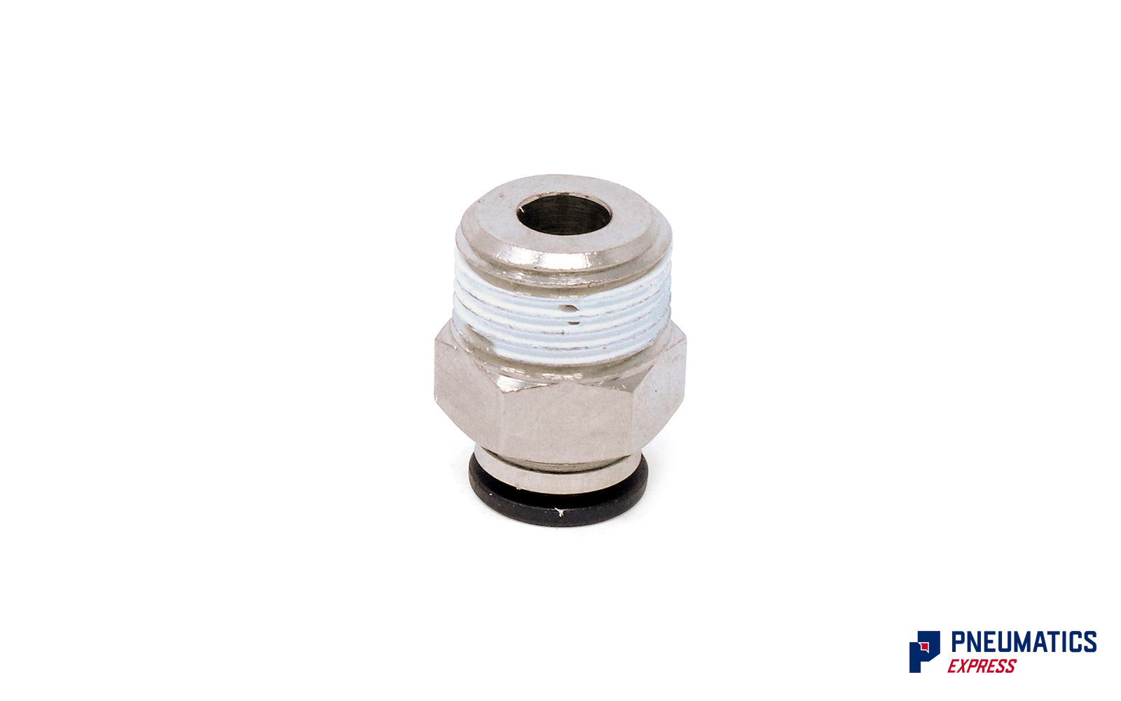 This is Watson Industries Male Stud pneumatic fitting that has a 8mm Push-In Fitting on one end, and a 3/8" BSP male thread on the other side with PTFE tape already conveniently applied. This is a real value proposition due to its price to quality ratio. It is very popular in the United Kingdom.