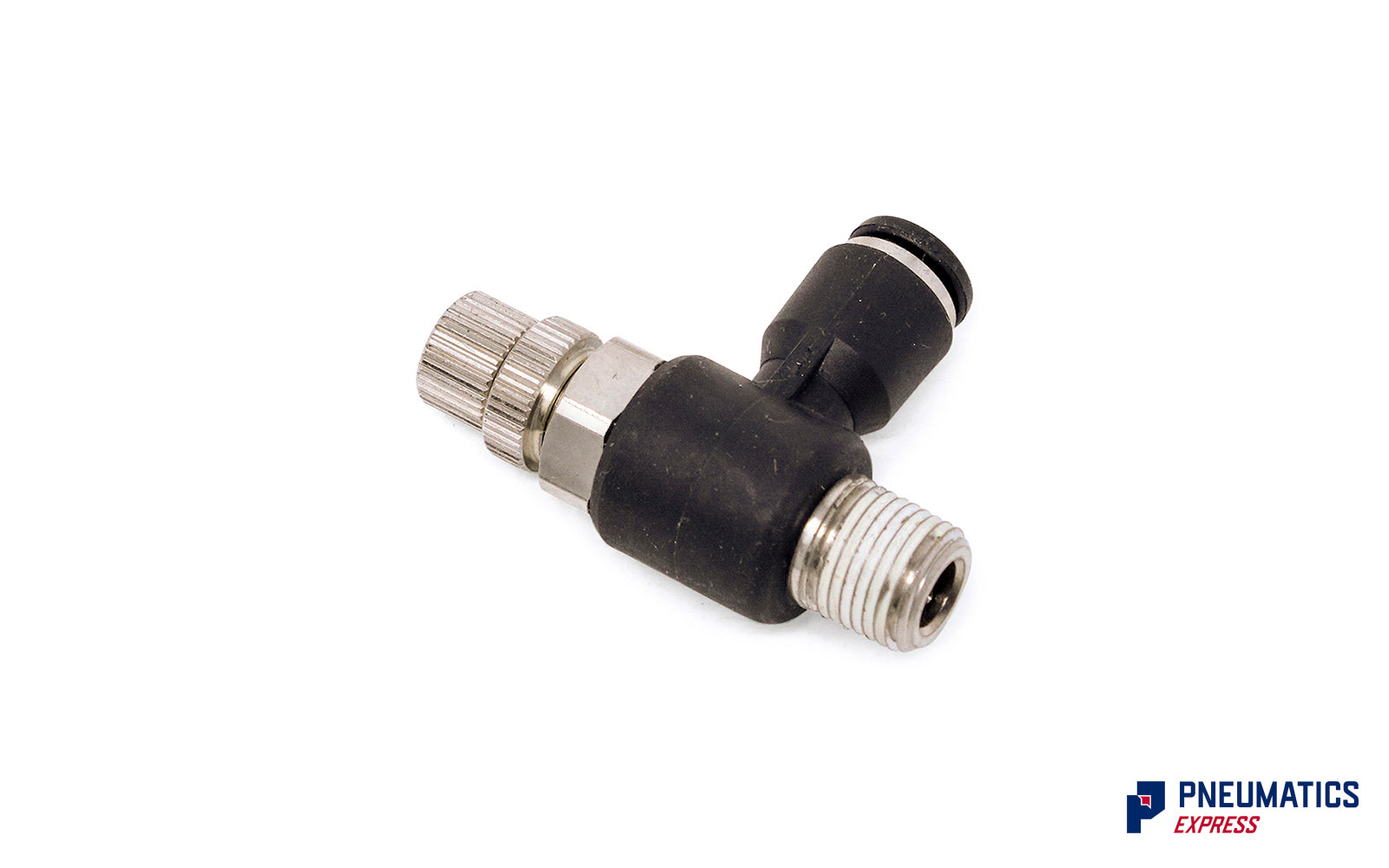 Flow control, or speed control, fittings allows for an operator to adjust flow into or out of a pneumic component. This can alter instroke or outsroke speeds amongst other variables. This fitting is in an elbow or L-shape. Fine adjustment via a needle valve.